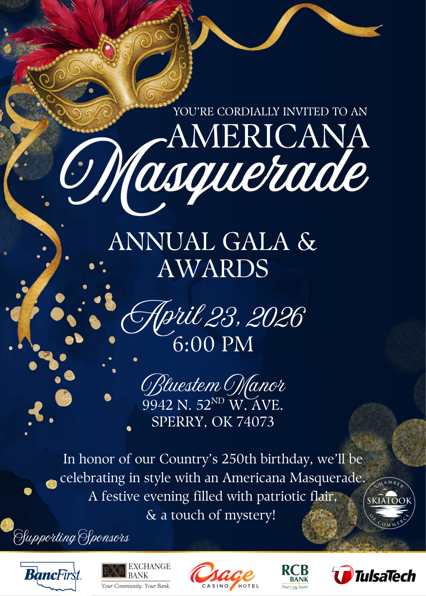 Find your best Red, White and/or Blue attire in celebration of the USA’s 250th Birthday. Want to add a touch of mystery? Pair a mask with it. There just may be a prize for the best dressed in style.